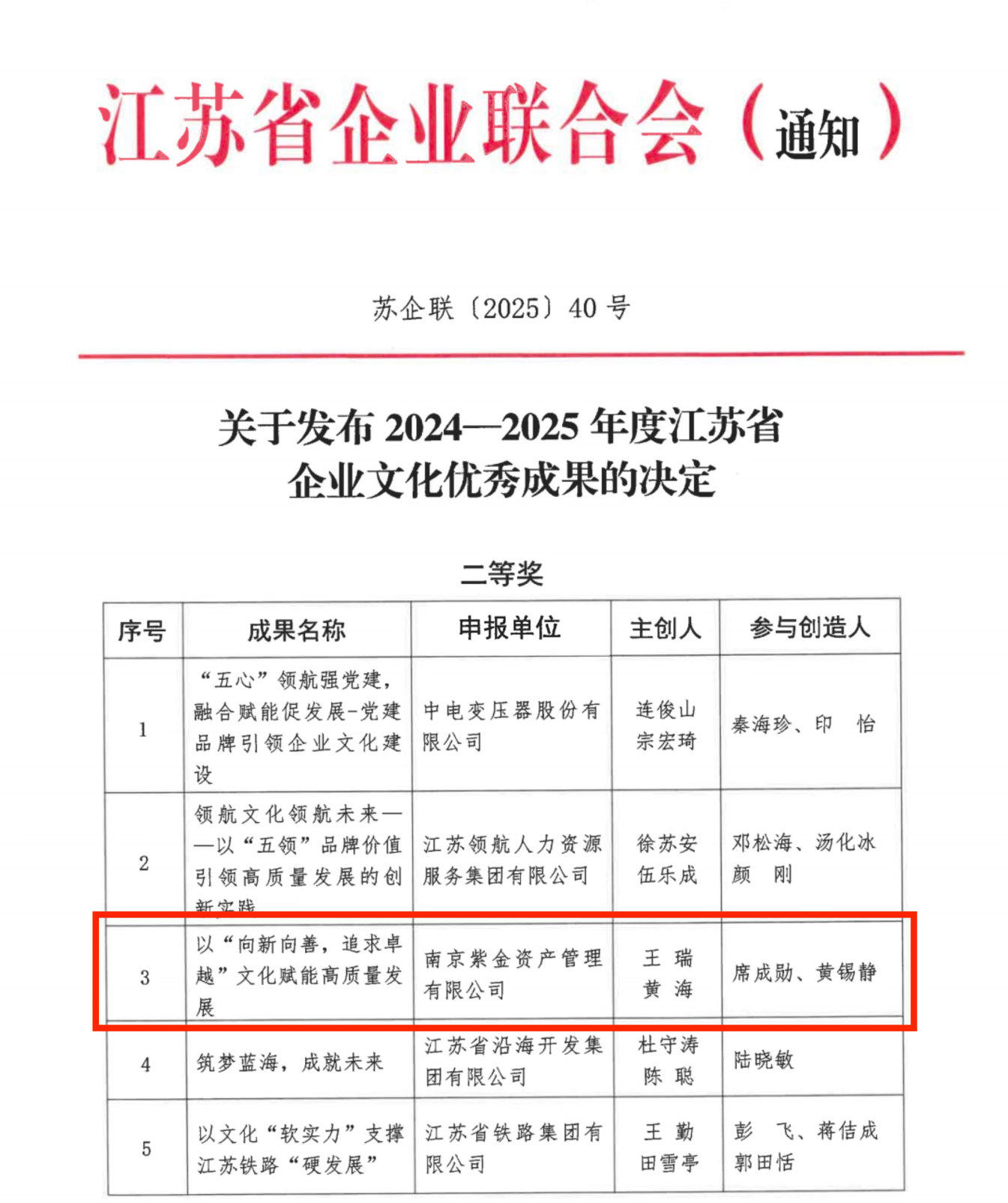 12月25日,江蘇省企業(yè)聯(lián)合會發(fā)布文件《關(guān)于發(fā)布2024—2025年度江蘇省企業(yè)文化優(yōu)秀成果的決定》(蘇企聯(lián)〔2025〕40號)。紫金資管申報的《以"向新向善,追求卓越"文化賦能高質(zhì)量發(fā)展》榮獲"2024—2025年度江蘇省企業(yè)文化優(yōu)秀成果二等獎"。該榮譽(yù)是對紫金資管長期堅持企業(yè)文化建設(shè)、以文化引領(lǐng)高質(zhì)量發(fā)展的充分肯定。
